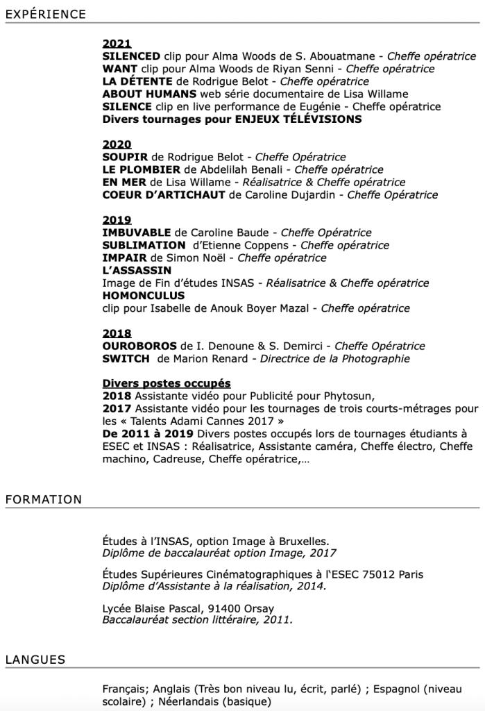 Diplômée de l’ESEC à Paris et de l’INSAS à Bruxelles section Image, j’aspire à devenir cheffe opératrice de fiction sur des longs-métrages. Je suis aussi intéressée par le documentaire, le reportage et la vidéo. J’aime aller à la rencontre de l’autre, découvrir le monde et y présenter ma créativité à travers l’image.